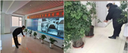图为神源投对值班人员进行体温检查、办公楼消毒。